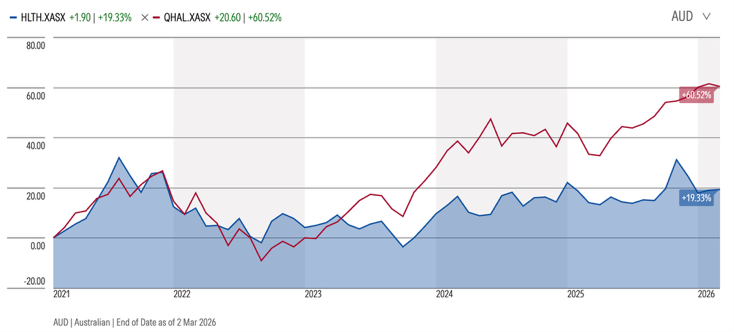 Figure 3: Five-year performance of the technology- and industrials-anchored Global Quality Stocks ETF (QHAL) versus the Global Healthcare Stocks ETF (HLTH)